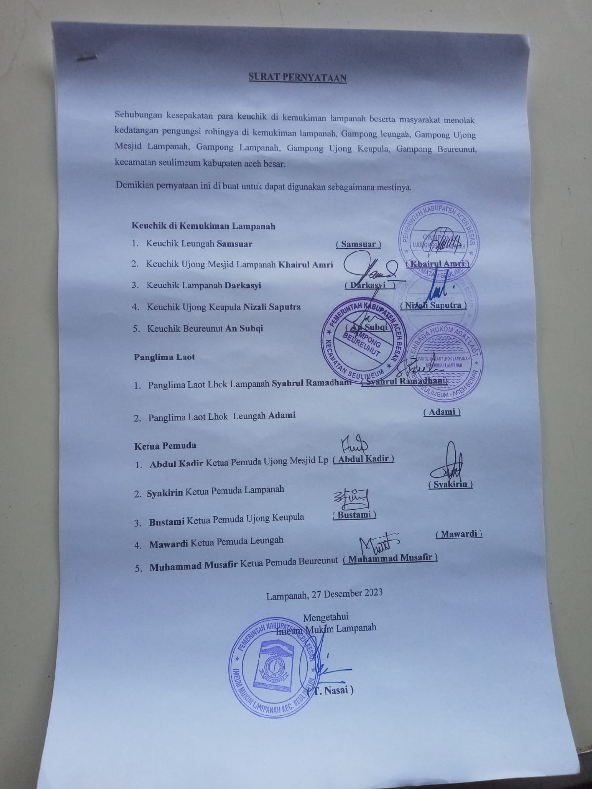 Tokoh dan masyarakat Kemukiman Lamteuba usai rapat koordinasi dan menolak wacana penempatan Etnis Rohingya ke Lampanah dan Lamteuba, Kamis (28/12/2023). FOTO/ISTIMEWA