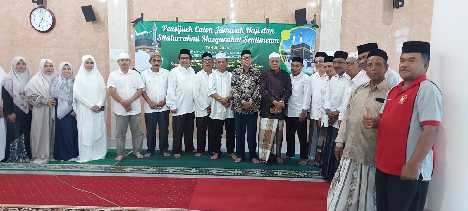 posaceh.com, Kota Jantho – Masyarakat Kecamatan Seulimeum, menggelar prosesi peusijuk (tepung tawar-red) bagi 17 calon jamaah haji, di Masjid Besar Al Ittihadiyah, Kecamatan Seulimeum, Kabupaten Aceh Besar, Sabtu (18/4/2026).