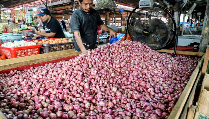 Pedagang merapikan bawang merah di Pasar Induk Lambaro, Kecamatan Ingin Jaya, Aceh Besar, Sabtu (07/02/2026). Harga bawang merah harga Rp 40.000/kg. FOTO/BEDU SAINI