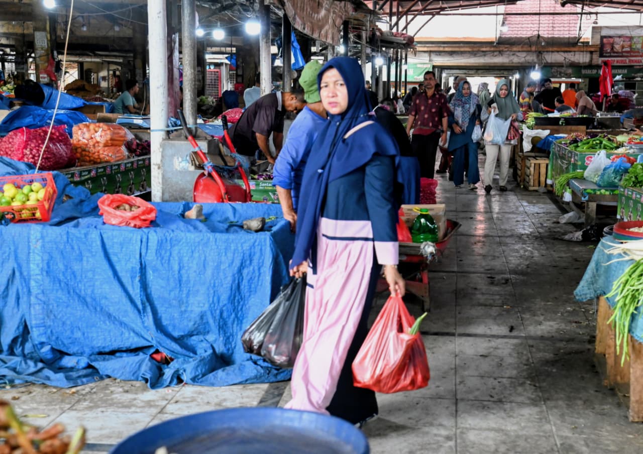 Seorang warga membawa barang belanjaan di Pasar Induk Lambaro, Kecamatan Ingin Jaya, Aceh Besar, Sabtu (07/02/2026). Harga kebutuhan pokok masih stabil. FOTO/BEDU SAINI