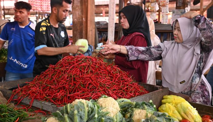 Warga membeli cabai di di Pasar Induk Lambaro, Kecamatan Ingin Jaya, Aceh Besar, Sabtu (07/02/2026). Harga cabai masih stabil dengan harga Rp 35.000/kg. FOTO/BEDU SAINI