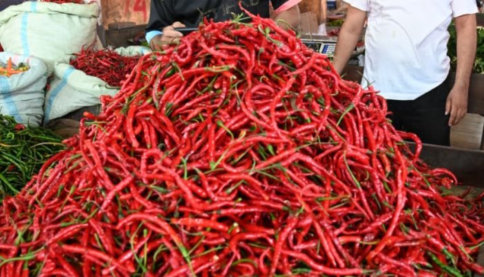 Pedagang merapikan cabai di Pasar Induk Lambaro, Kecamatan Ingin Jaya, Aceh Besar, Sabtu (07/02/2026). Harga cabai masih stabil dengan harga Rp 35.000/kg. FOTO/BEDU SAINI