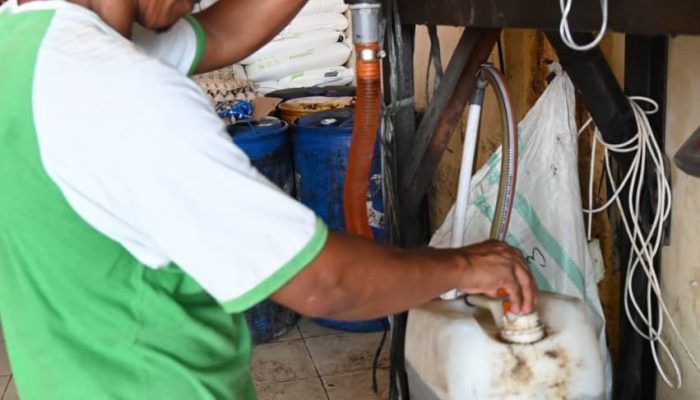 Pekerja toko mengisi minyak makan curah di di Pasar Induk Lambaro, Kecamatan Ingin Jaya, Aceh Besar, Sabtu (07/02/2026). Harga minyak makan curah Rp 19.500/liter FOTO/BEDU SAINI