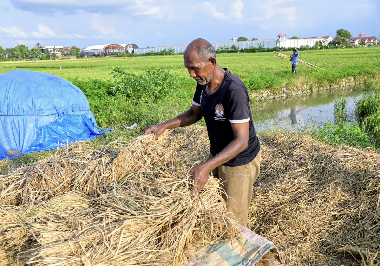Seorang ibu berjalan di pematang sawah usai memanen padi di area persawahan Gampong Meunasah Manyang PA, Kecamatan Ingin Jaya, Aceh Besar, Jumat (03/04/2026) sore. FOTO/BEDU SAINI