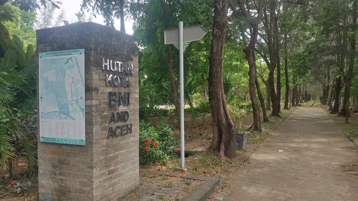 Seusai parkir kendaraan, berjalan ke atas jembatan gantung untuk masuk ke area Hutan Kota, karena roda dua dilarang masuk. Begitu masuk, dapat melihat tugu Hutan Kota dengan logo bank BNI sebagai pendukung pembangunan Hutan Kota. Bank BNI sudah tidak ada lagi di Aceh, sejak sistim bank syariah diberlakukan beberapa tahun lalu.