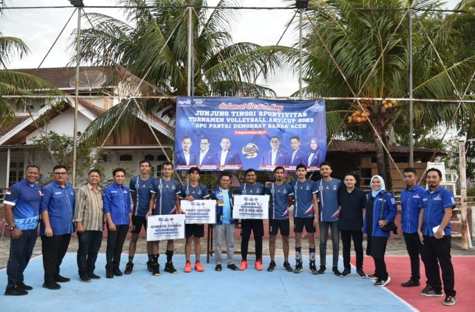 posaceh.com, Banda Aceh – Tim Mercy Club Banda Aceh tampil sebagai juara turnamen Volly AHY Cup 2023 yang digelar DPC Partai Demikrat Kota Banda Aceh dalam rangka Hari Ulang Tahun (HUT) ke-22 Partai Demokrat, usai menang atas NNVC IMKA Banda Aceh, di Lapangan NNVC Ie Masen Kayee Adang Kecamatan Syiah Kuala, Kota Banda Aceh, Minggu (10/9/2023).