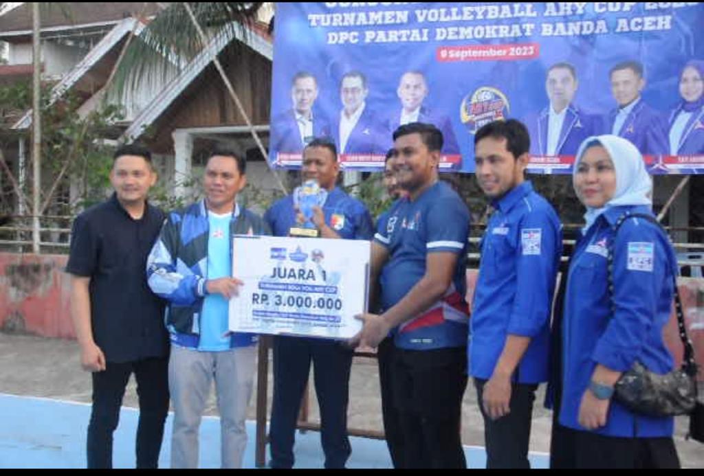 Ketua DPC Partai Demokrat Banda Aceh H Isnaini Husda didampingi Sekretaris dan Bendahara DPC PD Banda Aceh menyerahkan piala dan uang tunai kepada juara 1 Voli AHY Cup 2023 di Lapangan NNVC Ie Masen Kayee Adang Kecamatan Syiah Kuala, Kota Banda Aceh, Minggu (10/9/2023). FOTO/ WAHYU DESMI