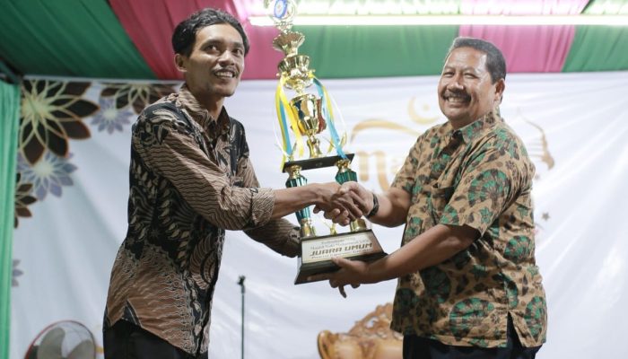 Ketua Panitia Pelaksana MTQ ke-2 Gampong Tanjong, Firdaus Akbar (kiri) menyerahkan piala kepada Kepala Dusun Ateuk Padang, Zulfidar, sebagai Juara Umum MTQ di Meunasah Tanjong, Kecamatan Lhoknga, Aceh Besar, Selasa (12/11/2024) malam. FOTO/ILHAM RAMADANI