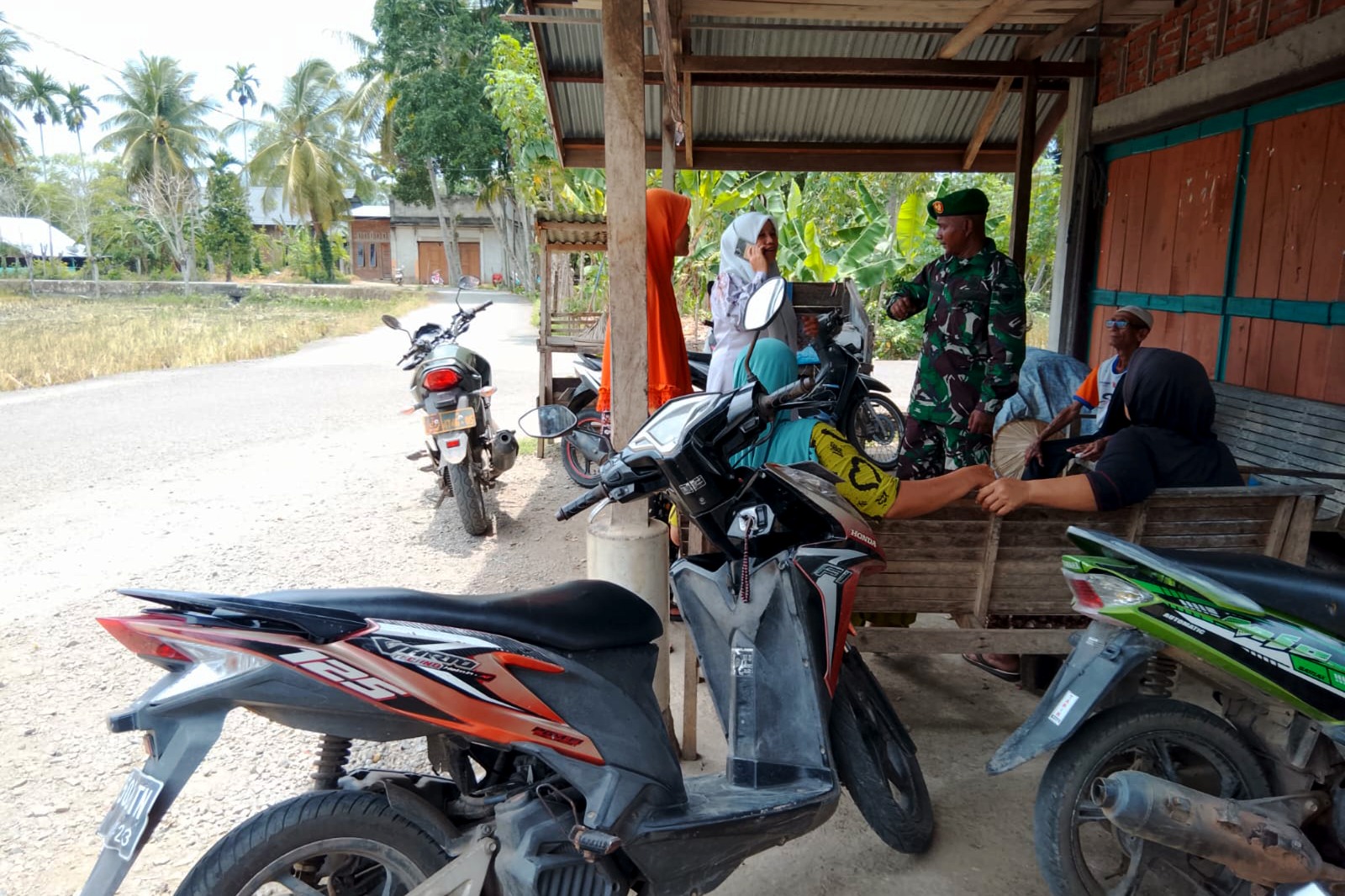 Babinsa Koramil 26/Kuta Cot Glie, Serda Hamdani, melaksanakan Binter dengan cara yang menyentuh sisi humanis bertatap muka langsung dengan warga di sebuah kedai di Gampong Barih Lhok, Kecamatan Kuta Cot Glie, Aceh Besar, Rabu (8/4/2026). FOTO/ PENERANGAN KODIM 0101/KBA