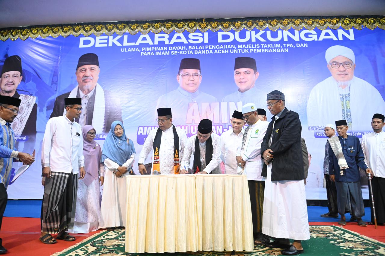 Komitmen ini, sekaligus sebagai maklumat pasangan AMIN kepada para ulama yang dibacarkan langsung oleh Aminullah Usman di depan seribuan pendukungnya dalam acara deklarasi dukungan untuk kemenangan pasangan AMIN di Amel Convention Hall, Ulee Kareng, Banda Aceh, Sabtu (16/11/2024) pagi.