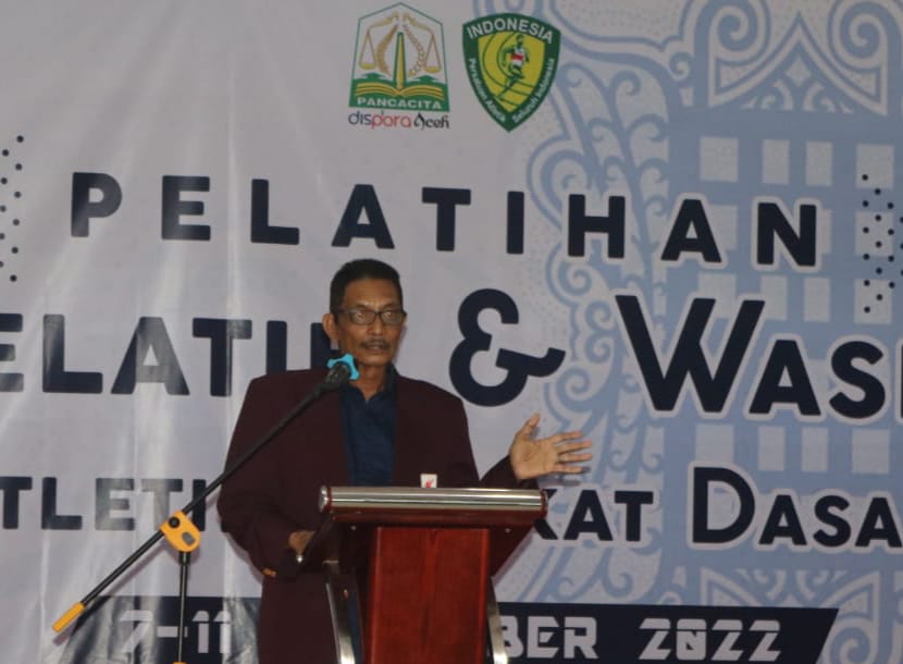 Ketua Umum Pengprov PASI Aceh, Drs Bachtiar Hasan, M.Pd saat menyampaikan sambutan pada pembukaan pelatihan wasit dan pelatih atletik tingkat dasar di Hotel Grand Aceh, Banda Aceh, Senin (7/11/2022) malam. Foto : PASI Aceh.