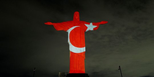 Pemandangan Patung Yesus Kristus Sang Penebus di Rio de Janeiro, Brasil saat memberikan penghormatan untuk para korban gempa Turki dan Suriah, pada 16 Februari 2023. Bencana gempa bumi yang melanda wilayah perbatasan Turki dan Suriah telah menyisakan duka mendalam bagi dunia.