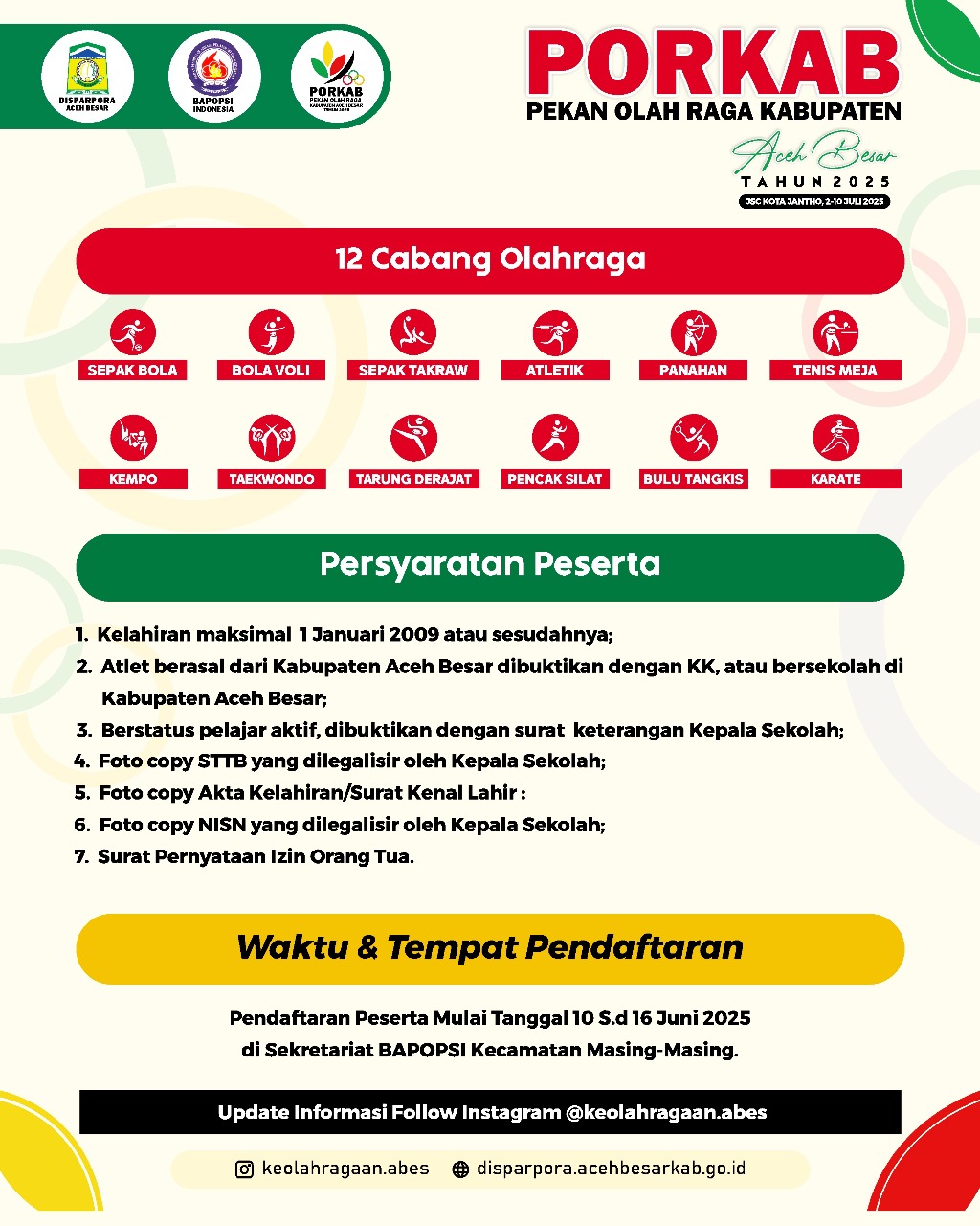 “Kami berharap seluruh peserta memenuhi persyaratan administrasi dengan lengkap agar proses seleksi dan verifikasi berjalan lancar. Untuk informasi lebih lanjut, masyarakat dapat mengakses website kami di disparpora.acehbesarkab.go.id atau melalui akun Instagram @keolahragaan.abes,” pungkas Abdullah.(Wahyu Desmi)