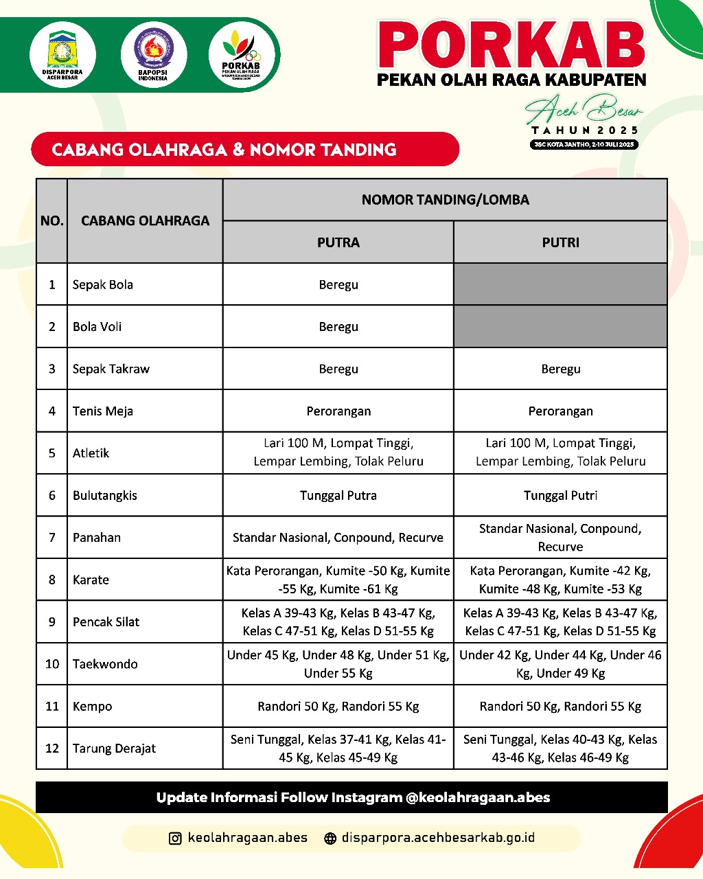 “Sebanyak 12 cabor akan dipertandingkan pada Porkab tahun ini. Pertandingannya akan berlangsung dari tanggal 2 hingga 10 Juli 2025 di Jantho Sport City (JSC),” jelas Abdullah yang juga di dampingi oleh Kepala Bidang Keolahragaan Disparpora Aceh Besar, Safrizal S.Sos, M.Si