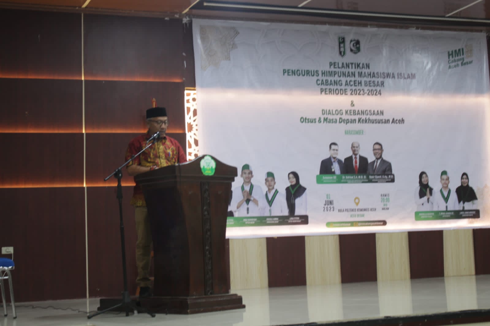 posaceh.com, Kota Jantho – Pemerintah Kabupaten (Pemkab) Aceh Besar mengajak Himpunan Mahasiswa Islam (HMI) Cabang Aceh Besar ikut andil dalam pembangunan, hal itu disampaikan oleh Penjabat (Pj) Bupati Aceh Besar, Muhammad Iswanto S.STP, MM melalui Asisten Pemerintahan Keistimewaan dan Kesejahteraan Rakyat, Farhan, AP saat memberikan sambutan pada acara pelantikan HMI Periode 2023-2024 dan Dialog Kebangsaan di Aula Poltekkes Kemenkes Aceh, Kecamatan Darul Imarah, Aceh Besar, Kamis (1/6/2023) malam.