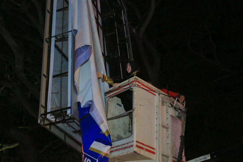 Di lokasi itu, tak kurang dari delapan baliho beragam ukuran dipotong, dibongkar, lalu diamankan petugas. Illiza sendiri turut menaiki mobil crane untuk mencopot salah satu baliho berukuran besar.