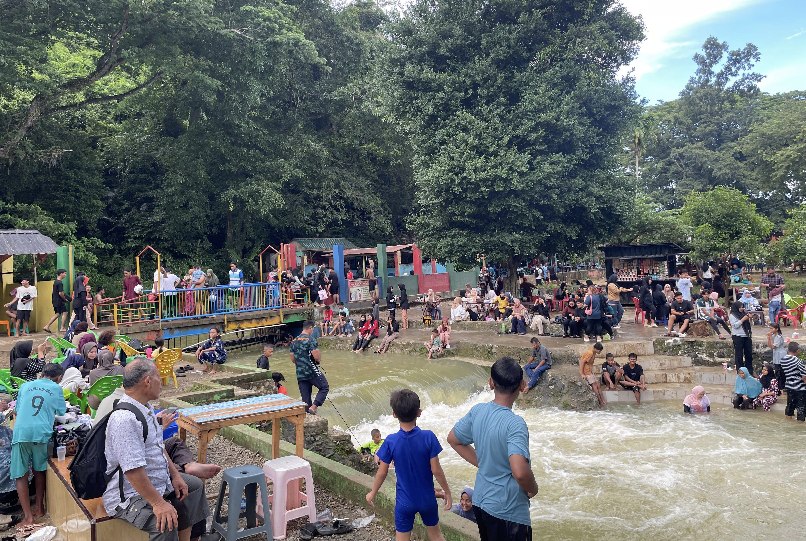 posaceh.com, Kota Jantho – Ratusan pengunjung memadati objek wisata Kolam Mata Ie yang terletak di Kecamatan Darul Imarah, Kabupaten Aceh Besar. Kehadiran pengunjung yang membludak tersebut menjadi pertanda bahwa tempat wisata alam tersebut masih menjadi destinasi favorit masyarakat untuk menghabiskan waktu bersama keluarga, terutama di akhir pekan, Minggu (13/4/2025).