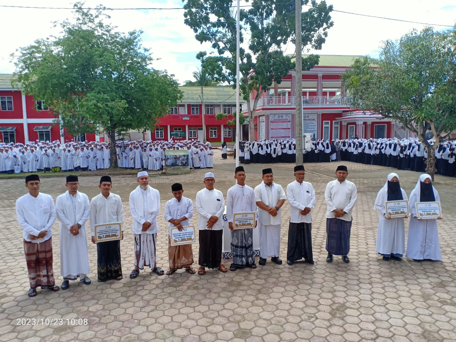 Pj Bupati Aceh Besar, Muhammad Iswanto SSTP MM menyerahkan bantuan beasiswa kepada Santri dalam upacara Peringatan Hari Santri Nasional Tahun 2023, di Komplek Dayah Darul Muta'allimin Gampong Meulayo, Kecamatan Blang Bintang, Aceh Besar, Senin (23/10/2023). FOTO/MC ACEH BESAR