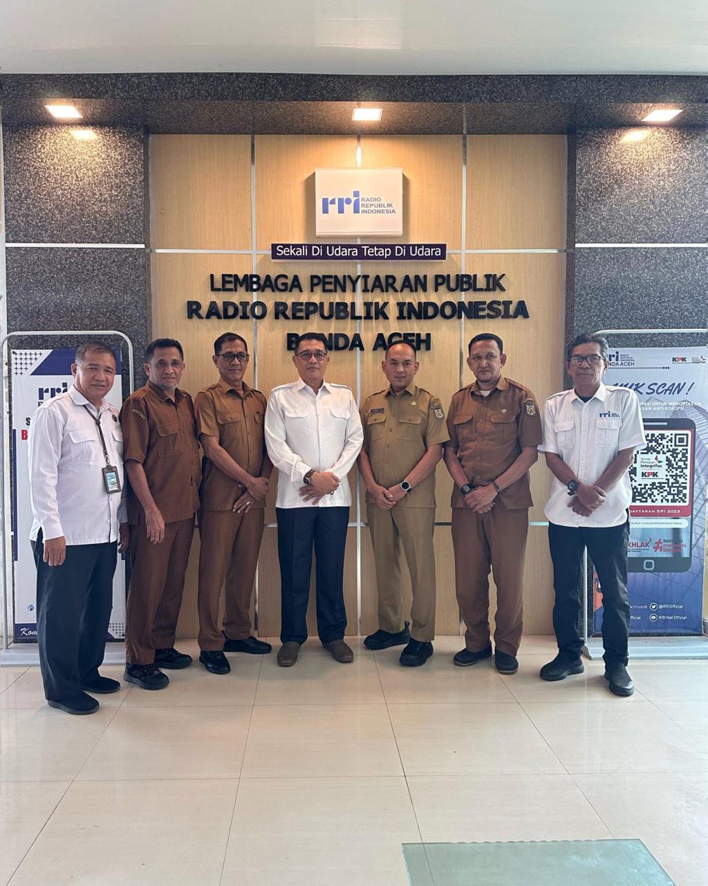 Kepala Diskominfotik Kota Banda Aceh, Muhammad Zubir, Kepala Bidang Pengelolaan Informasi Publik, Rahadian, Kepala Bidang Hubungan Media dan Penyelenggaraan Smart City, Nourchalis dan Kepala Bidang Statistik, Jauhari foto bersama Kepala RRI Banda Aceh, Muhsin Zein, Ketua Tim Pemberitaan, Arie Binsar Hatorangan, Ketua Tim Layanan Pengembangan Usaha (LPU), Wahidin dan Pengelola Redaksi dan Peliputan , Lismawarni Arachman, di RRI Banda Aceh, Senin (27/4/2026).