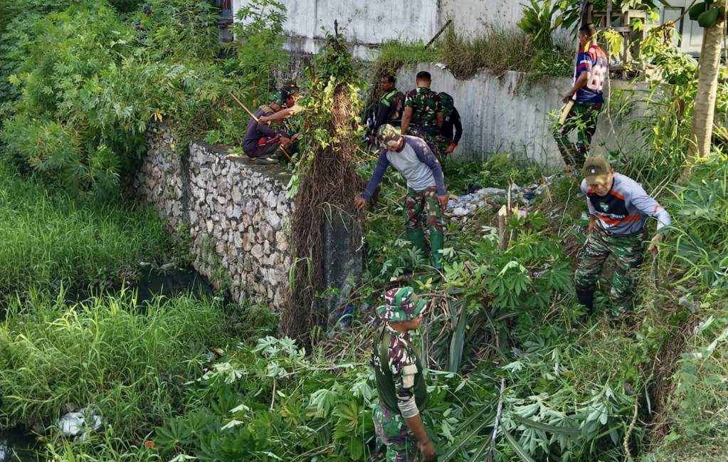 Personel TNI Bersama Warga Bersihkan Drainase Kawasan Bundaran Lambaro Aceh Besar