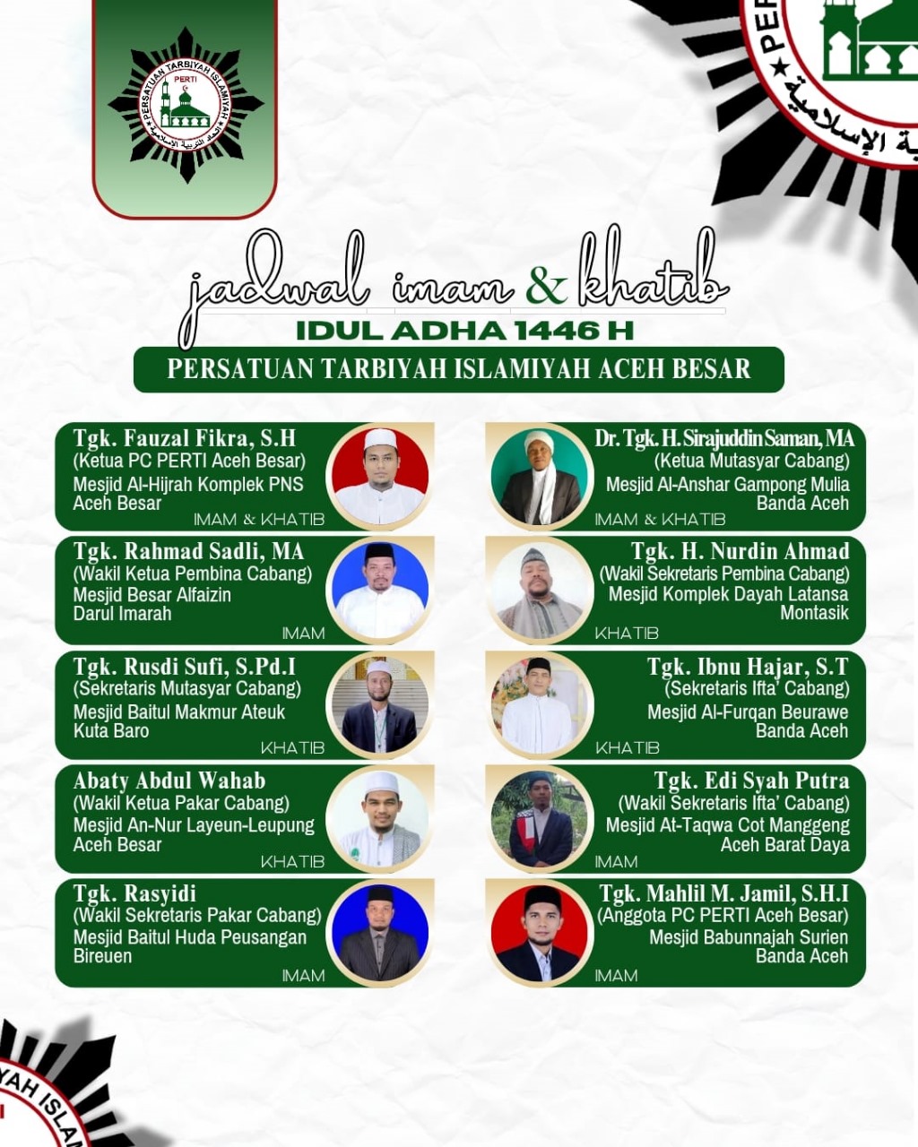 Ketua PC PERTI Aceh Besar, Tgk. Fauzal Fikra, S.H, akan menjadi imam sekaligus khatib di Masjid Al-Hijrah Kompleks PNS Aceh Besar. Beliau menegaskan pentingnya menjaga semangat ukhuwah islamiyah dalam momentum Idul Adha. “Idul Adha adalah momentum mempererat tali silaturahmi umat Islam. Semoga pelaksanaan salat dan khutbah di setiap masjid dapat berjalan dengan lancar dan membawa keberkahan bagi kita semua,” ujarnya.