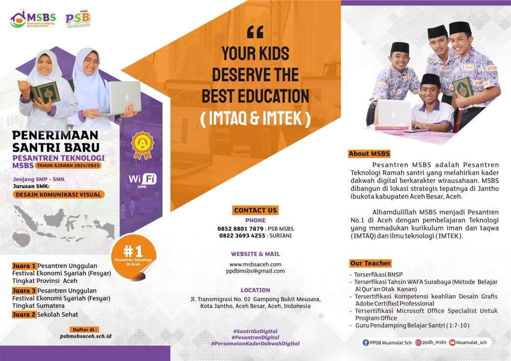 posaceh.com, Kota Jantho – Pesantren Teknologi MSBS merupakan pesantren tekhnologi ramah santri yang bertekad melahirkan generasi muda sebagai kader dakwah digital berkarakter wirausaha membuka pendaftaran santri baru.