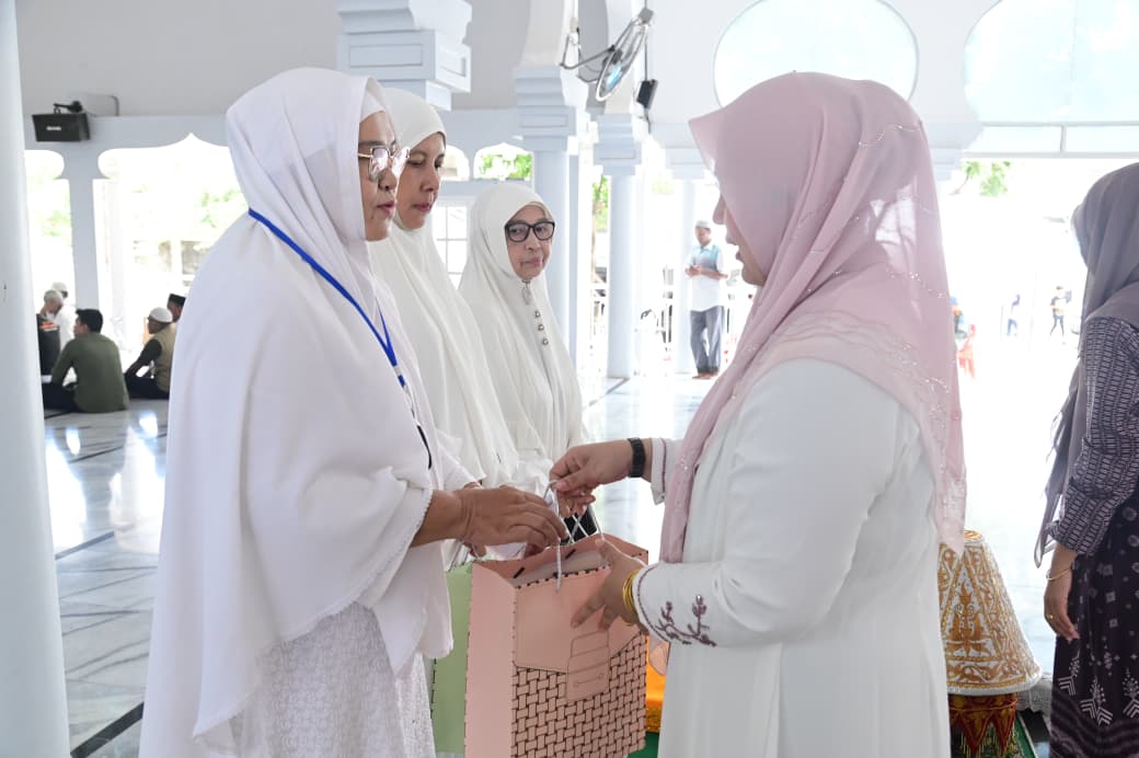 Ketua TP PKK Aceh Besar, Rita Mayasari melaksanakan Prosesi peusijuk dan pelepasan jamaah calon haji Aceh Besar 1447 H/2026 M di Masjid Bustanul Jannah, Ajuen, Peukan Bada, Selasa (28/04/2026). FOTO/ MUHAMMAD