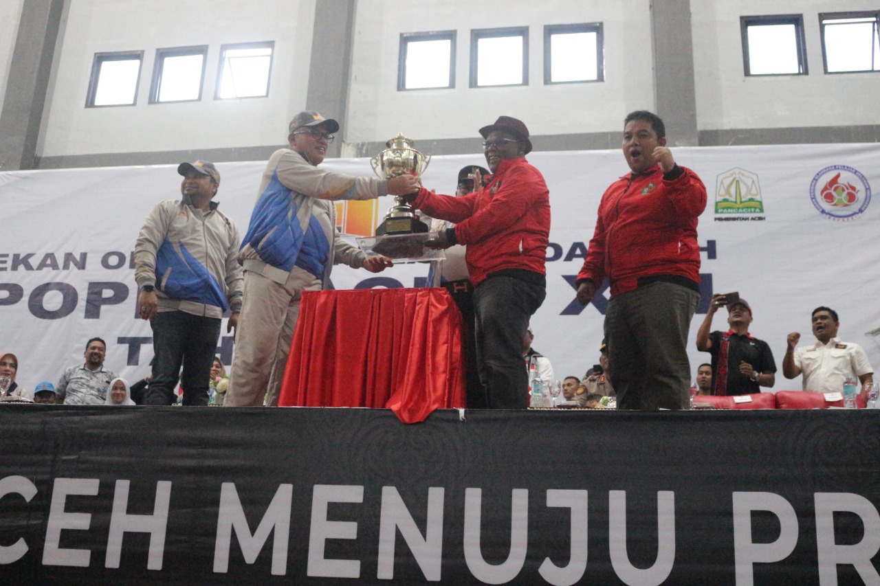Sekretaris Daerah Aceh, dr. Taqwallah, menyerahkan piala bergilir Kepada Bupati Pidie, Roni Ahmad, sebagai Juara Umum Popda Ke-XVI Pekan Olahraga Pelajar (Popda) XVI di Gos Meulaboh, Minggu (26/6/2022). FOTO IST