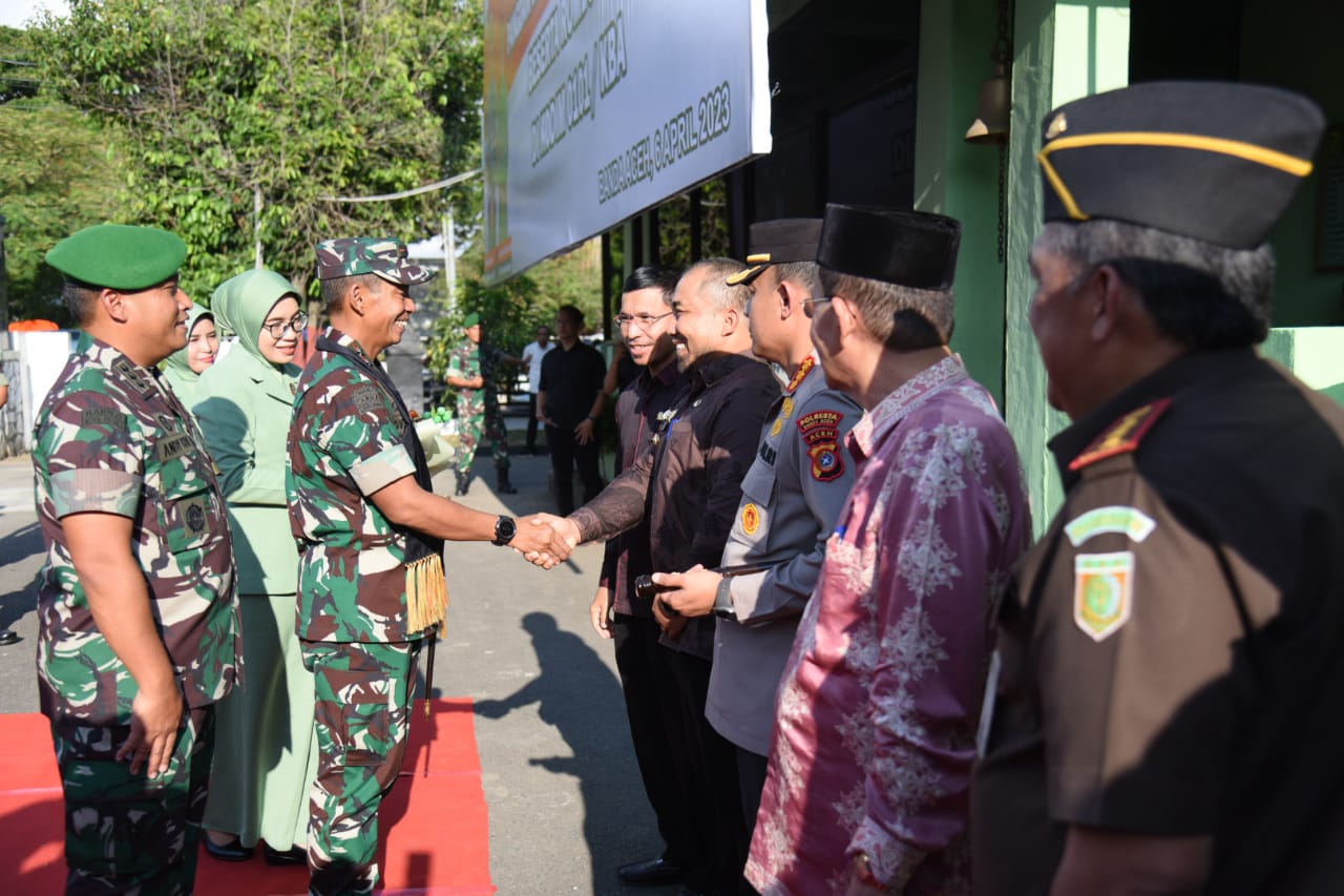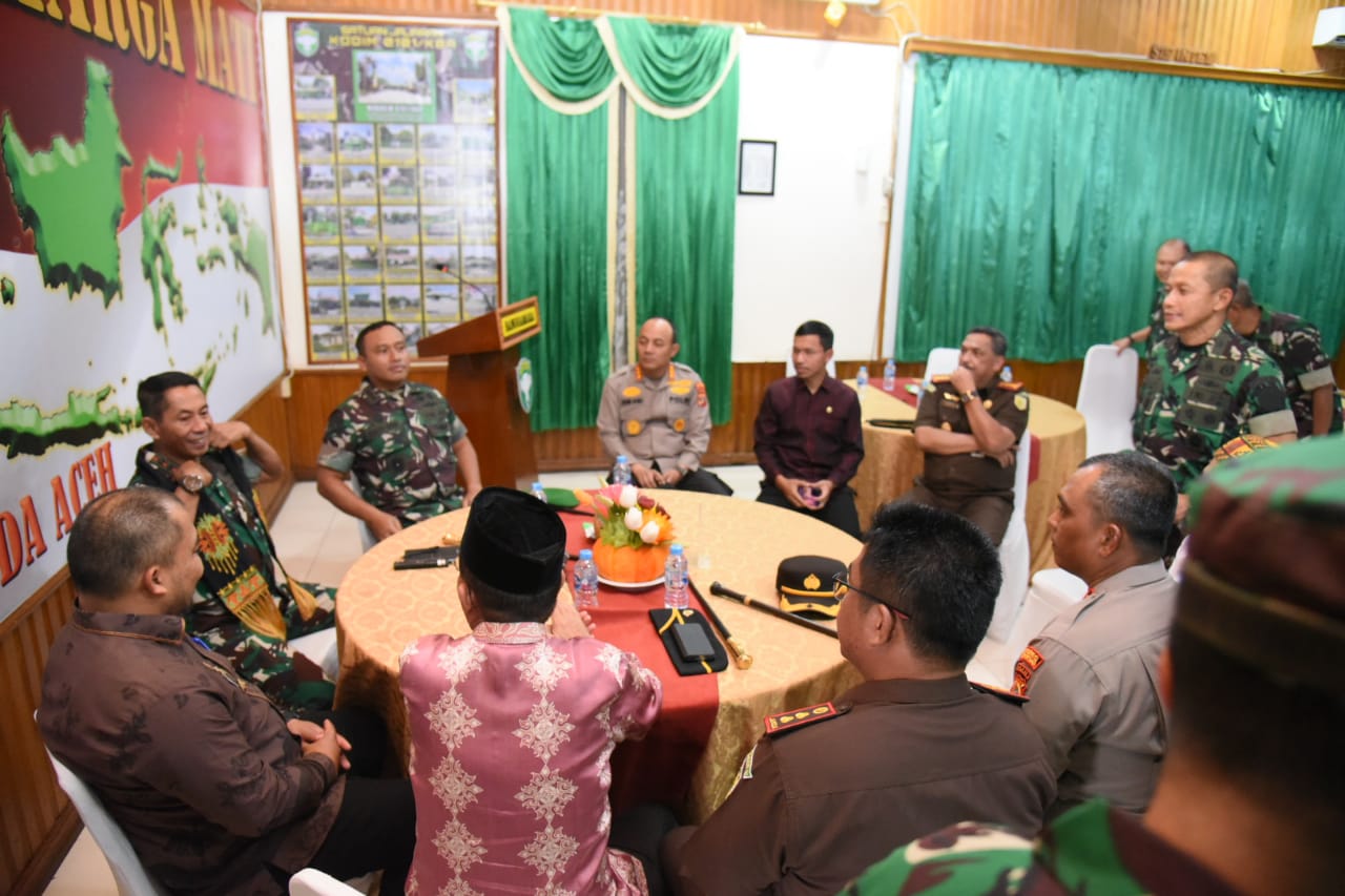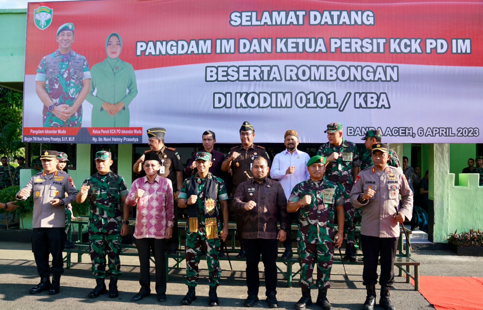 posaceh.com, Banda Aceh – Penjabat (Pj) Bupati Aceh Besar Muhammad Iswanto S.STP MM menyambut kehadiran kunjungan kerja (Kunker) Panglima Kodam Iskandar Muda (Pangdam IM) Mayor Jenderal (Mayjen) TNI Novi Helmy Prasetya S.I.P, M.I.P. bersama Ketua Persatuan Istri Prajurit Kartika Chandra Kirana Panglima Daerah Iskandar Muda (Persit KCK PD IM) Nyonya Iin Novi Helmy Prasetya ke Markas Komando Distrik Militer (Makodim) 0101KBA, di Banda Aceh, Kamis (6/4/2023) sore.
