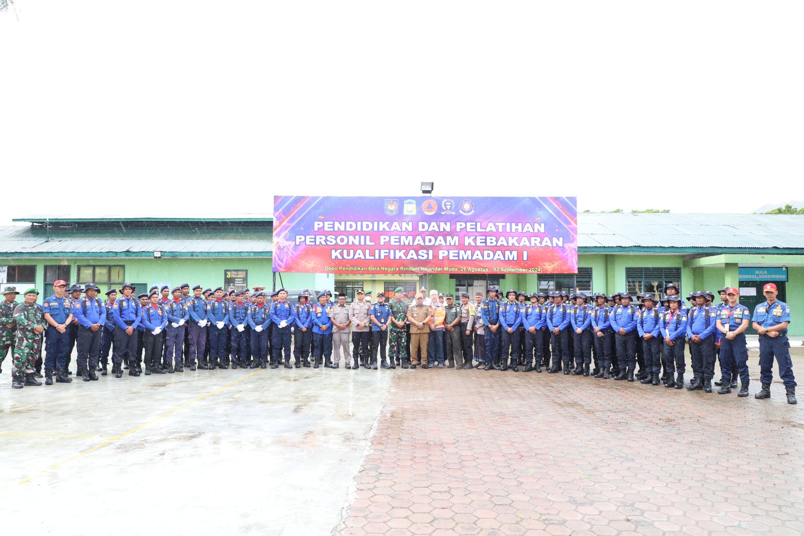 Pj Bupati Aceh Besar Muhammad Iswanto SSTP MM foto bersama dengan 38 peserta Diklat pemadam kebakaran kualifikasi pemadam I, di Lapangan Apel Bela Negara Rindam Iskandar Muda Mata Ie, Kecamatan Darul Imarah, Aceh Besar, Selasa (27/08/2024).