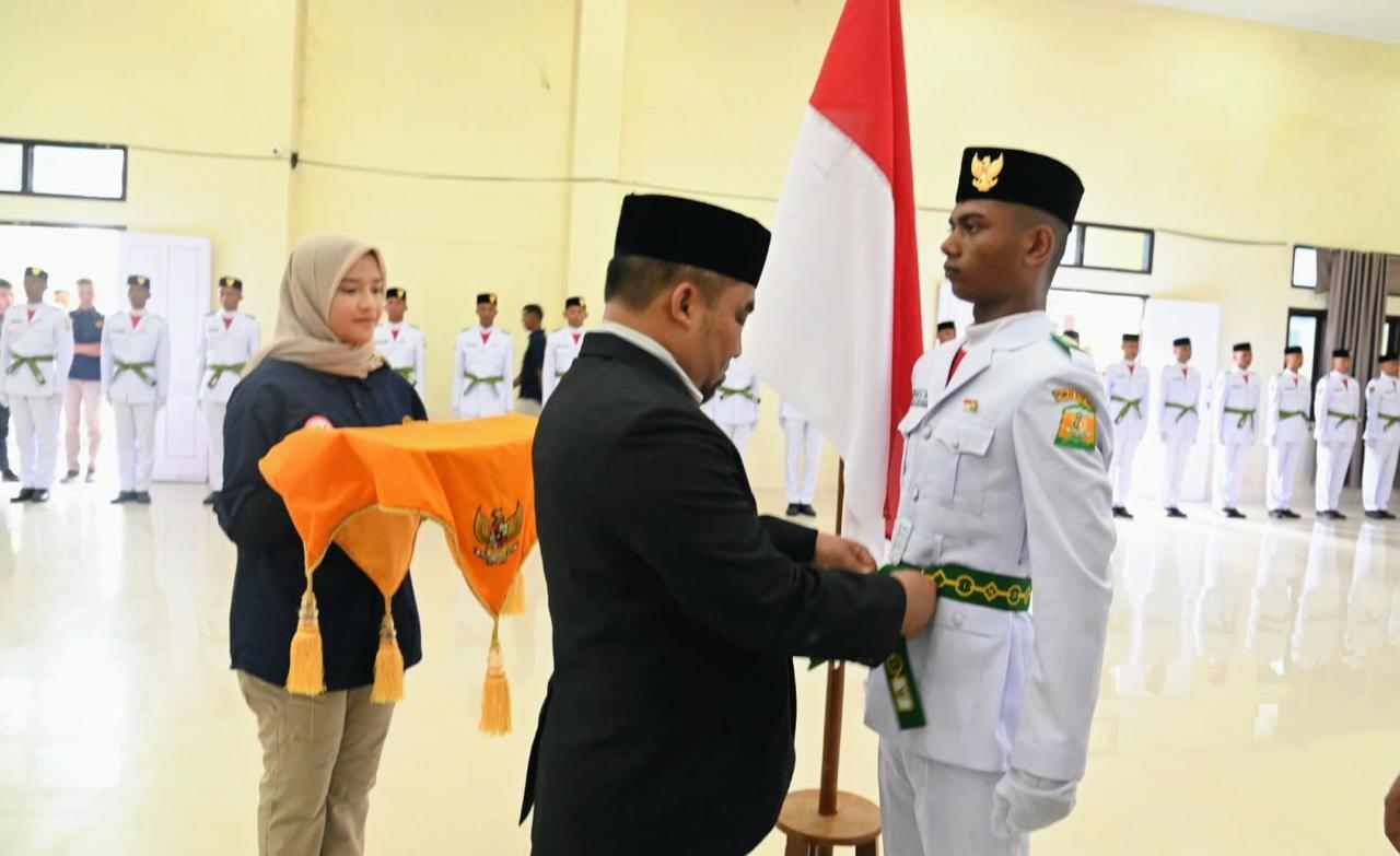 Pj Bupati Aceh Besar Muhammad Iswanto SSTP MM mengukuhkan Pasukan Pengibar Bendera Pusaka Paskibraka Kabupaten Aceh Besar Tahun 20204 di Gedung SKB, Kota Jantho, Aceh Besar, Jumat (16/08/2024).