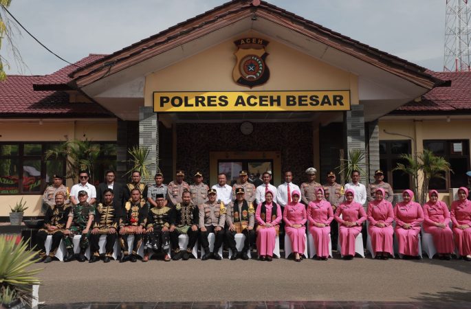 Foto bersama, Pj Bupati Aceh Besar Muhammad Iswanto SSTP MM, Kapolda Aceh Irjen Pol Achmad Kartiko SIK MH, Kapolres Aceh Besar AKBP Dhani Catra Nugraha SIK SH MH, para pejabat di lingkungan Polda Aceh, Polres Aceh Besar, dan Pemkab Aceh Besar, serta Bhayangkari Polda Aceh dan Polres Aceh Besar, dalam kunjungan kerja Kapolda Aceh ke Mapolres Aceh Besar, di Kota Jantho, Jumat (3/5/2024) pagi.