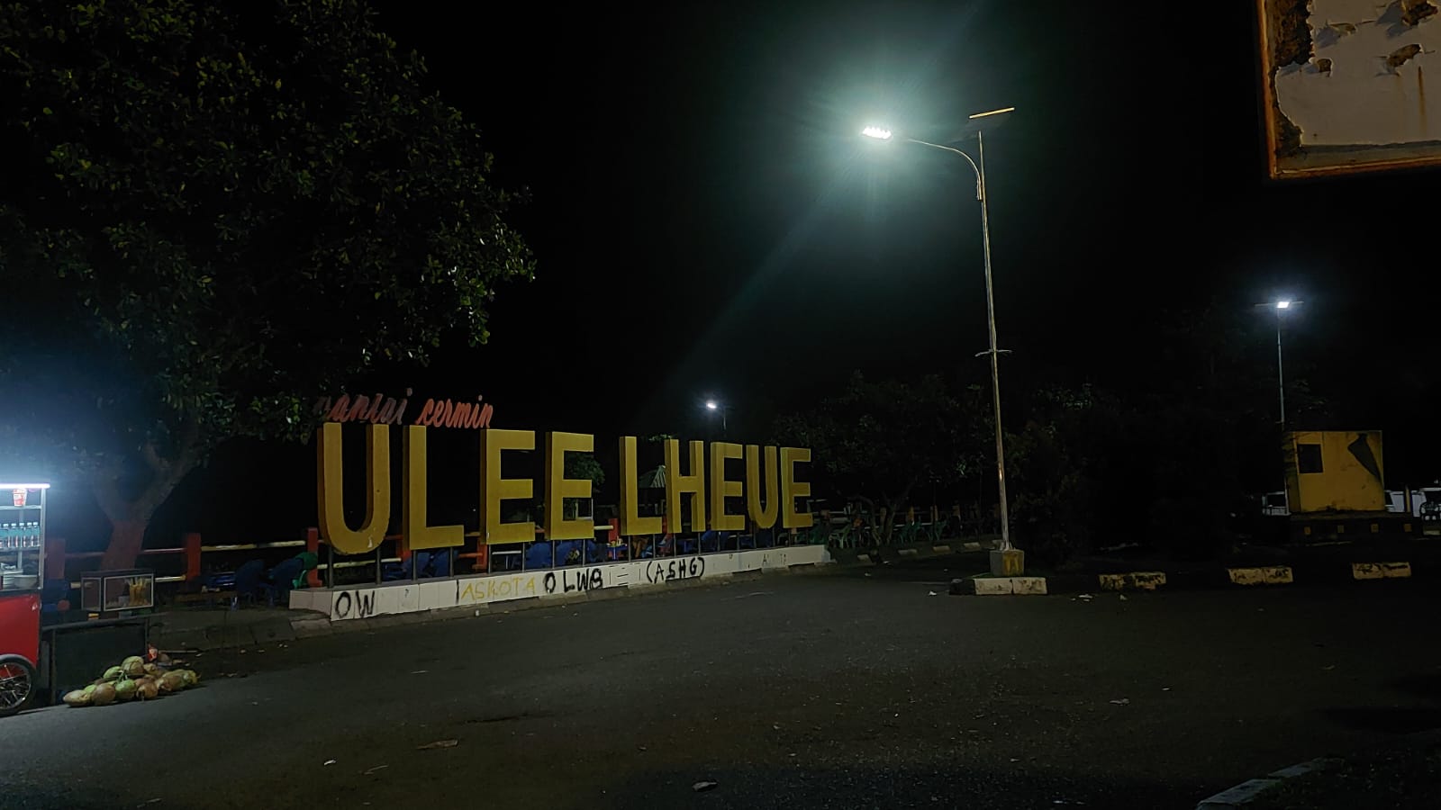Melaju lagi ke arah pelabuhan, pedagang jagung bakar, sate, kelapa muda atau lainnya dengan penerangan seadanya juga masih sepi pengunjung. Begitu juga di landmark Ulee Lheue dekat pintu masuk pelabuhan, hanya beberapa orang yang duduk sambil minum air kelapa muda.
