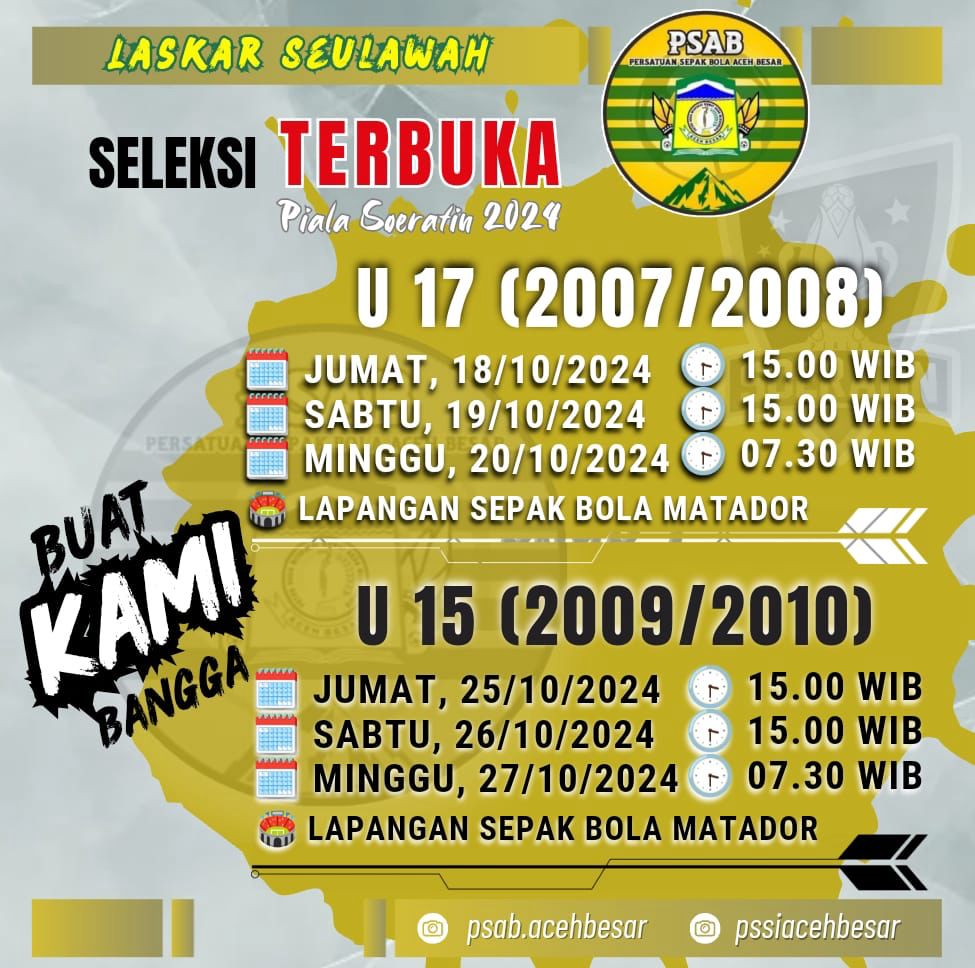 “Seleksi ini akan dilaksanakan mulai Jumat besok, hingga Minggu (18-20 Oktober 2024) di Lapangan Sepak Bola Matador, Aceh Besar. Para pemain muda yang memenuhi syarat berdasarkan tahun kelahiran, yaitu U-17 untuk pemain kelahiran 2007-2008 dan U-15 untuk kelahiran 2009-2010, dapat mengikuti seleksi ini,” ujar Mariadi ST MM, Plt Ketua PSAB Aceh Besar, di Kota Jantho, Kamis (17/10/2024) sore.