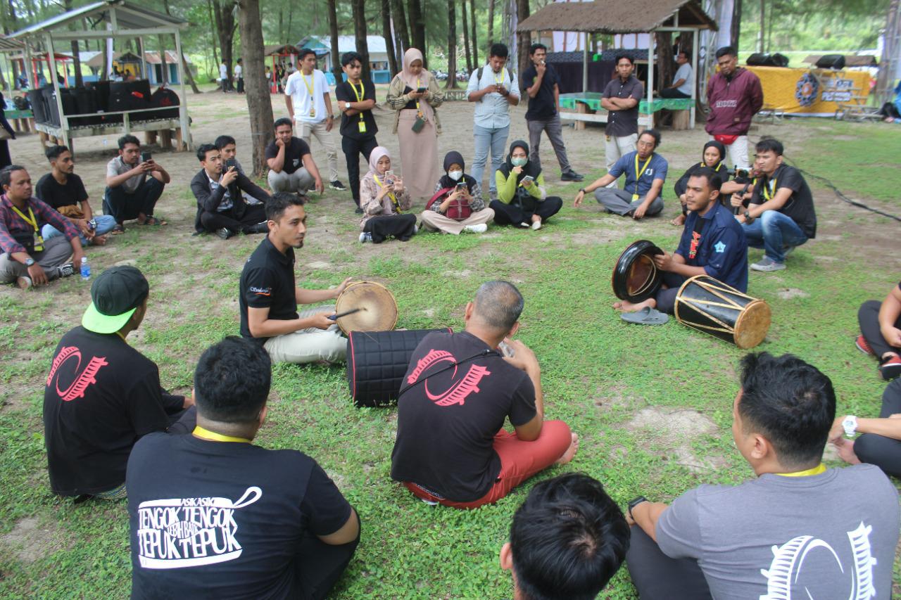 Peserta mengikuti klinik perkusi di Pantai Kreung Leupung, Kabupaten Aceh Besar, pada (28/7/2022). FOTO: DOK. DISBUDPAR ACEH