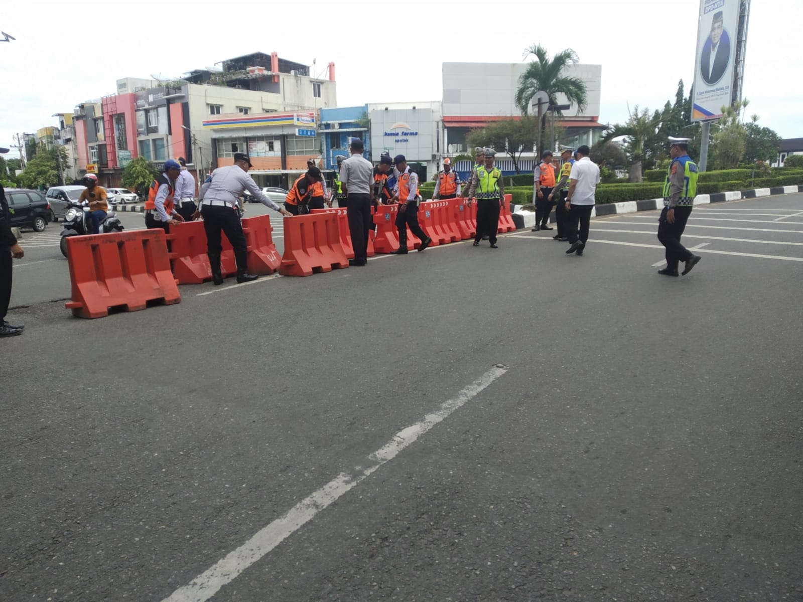 Kepala Dinas Perhubungan Kota Banda Aceh Wahyudi SSTP MSi memantau pemasang water barrier sebagai solusi sementara untuk membagi ruas perlintasan alternatif dari jalan utama di Kota Banda Aceh, Rabu (6/9/2023). FOTO/DOK DISHUB BANDA ACEH