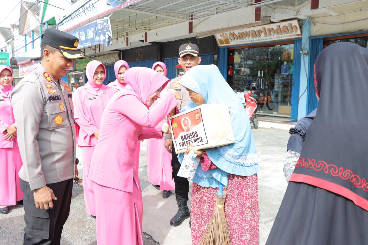 Kapolres Pidie AKBP Padli bersama Ketua Bhayangkari Cabang Pidie Ny. Yayuk Padli membagi paket Sembako kepada masyarakat dalam rangka menjelang HUT ke 71 Humas Polri, Selasa (25/10/2022). FOTO/HUMAS POLRES PIDIE