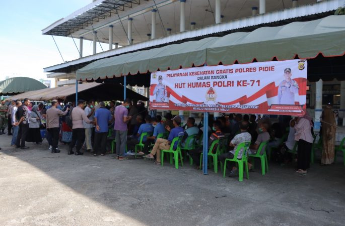 Selain pembagian paket sembako, Polres Pidie juga menggelar pelayanan kesehatan gratis untuk masyarakat kecamatan kota sigli dan Pidie serta untuk supir angkutan di Terminal Terpadu Kota Sigli di hari tersebut. Setelah mendapat pemeriksaan warga juga diberikan obat minum untuk menyembuhkan penyakit yang dideritanya.(Harmadi).