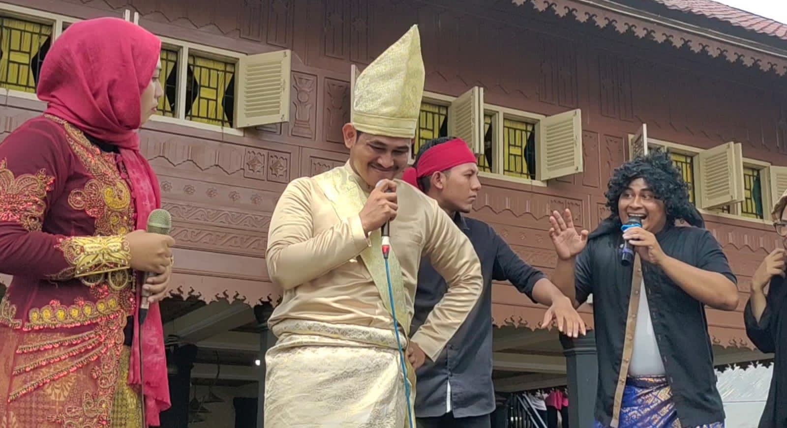 Personel Teater IPPERMATA sedang menghibur pengunjung dengan menampilkan atraksi teaterikal Amad Rahmanyang di anjungan Aceh Besar, Sabtu (11/11/2023). FOTO/ JAMAL DKAB
