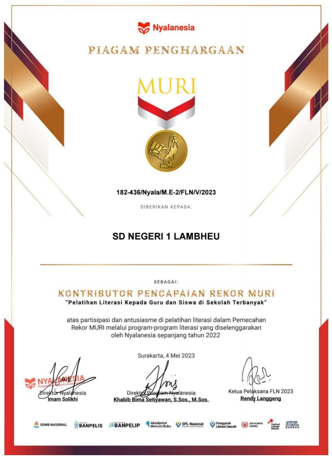 posaceh.com, Kota Jantho – SD Negeri 1 Lambheu, Kecamatan Darul Imarah, Kabupaten Aceh Besar mendapatkan Piagam Penghargaan sebagai salah satu “Kontributor Pencapaian Rekor Muri” atas pencapaian “Pelatihan Literasi Kepada Guru dan Siswa di Sekolah Terbanyak” yang telah diberikan kepada Nyalanesia dari Museum Rekor-Dunia Indonesia (MURI).