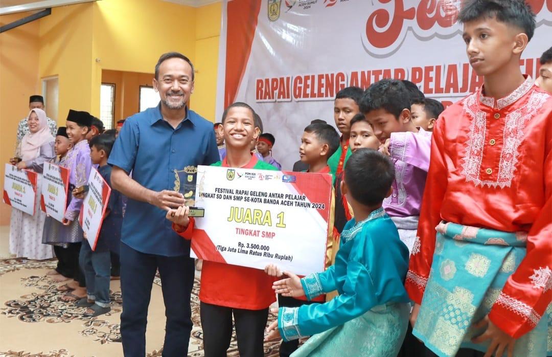 Sekretaris Disdikbud Banda Aceh Teuku Erwin Irham, SP, MSi menutup sekaligus menyerahkan hadiah pemenang ajang Festival Rapai Geleng antar pelajar SD dan SMP se-Kota Banda Aceh, di Aula Tekkomdik Banda Aceh, Sabtu (24/08/2024).