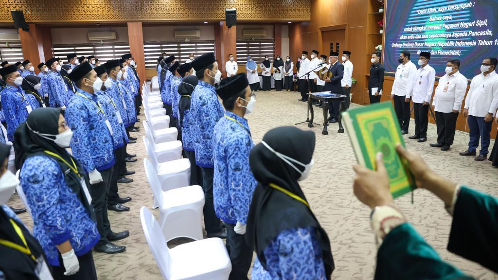 posaceh.com, Banda Aceh–Sekretaris Daerah (Sekda) Aceh, Taqwallah, mengingatkan para Pegawai Negeri Sipil (PNS) baru Pemerintah Aceh angkatan 2019 untuk menjadi aparatur sejati dengan cara hidup sederhana. Perilaku yang konsumtif bukanlah ciri PNS sejati. “Jadilah diri sendiri, masuk kantor tepat waktu dan berdoa agar hidup kita memudahkan orang lain,” kata Taqwallah saat melantik dan menyerahkan SK pengangkatan PNS formasi tahun 2019, di Gedung Serbaguna Kantor Gubernur Aceh, Rabu (1/12/2021).