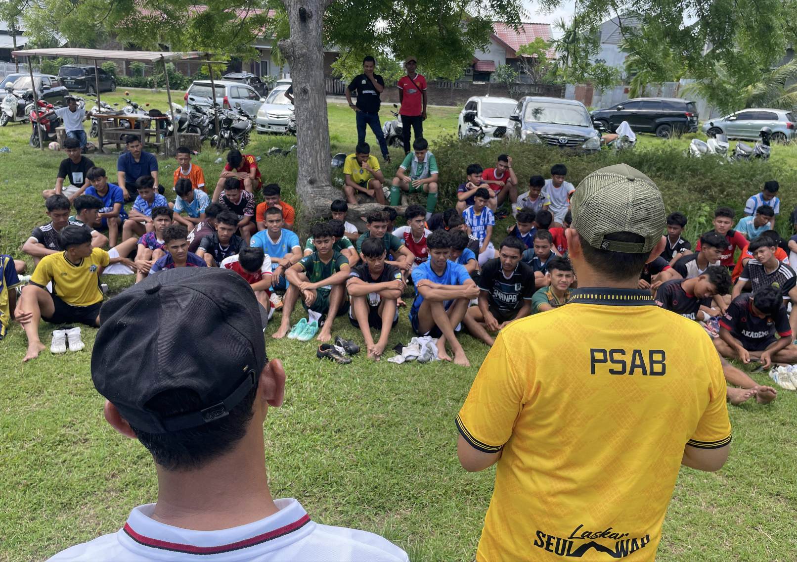 Plt Ketua PSAB Mariadi ST MT menyampaikan arahannya pada penutupan seleksi pemain PSAB U-17, di Lapangan Sepakbola Persima Meunasah Krueng, Kecamatan Ingin Jaya, Kabupaten Aceh Besar, Sabtu (25/4/2026). FOTO/ WAHYU DESMI