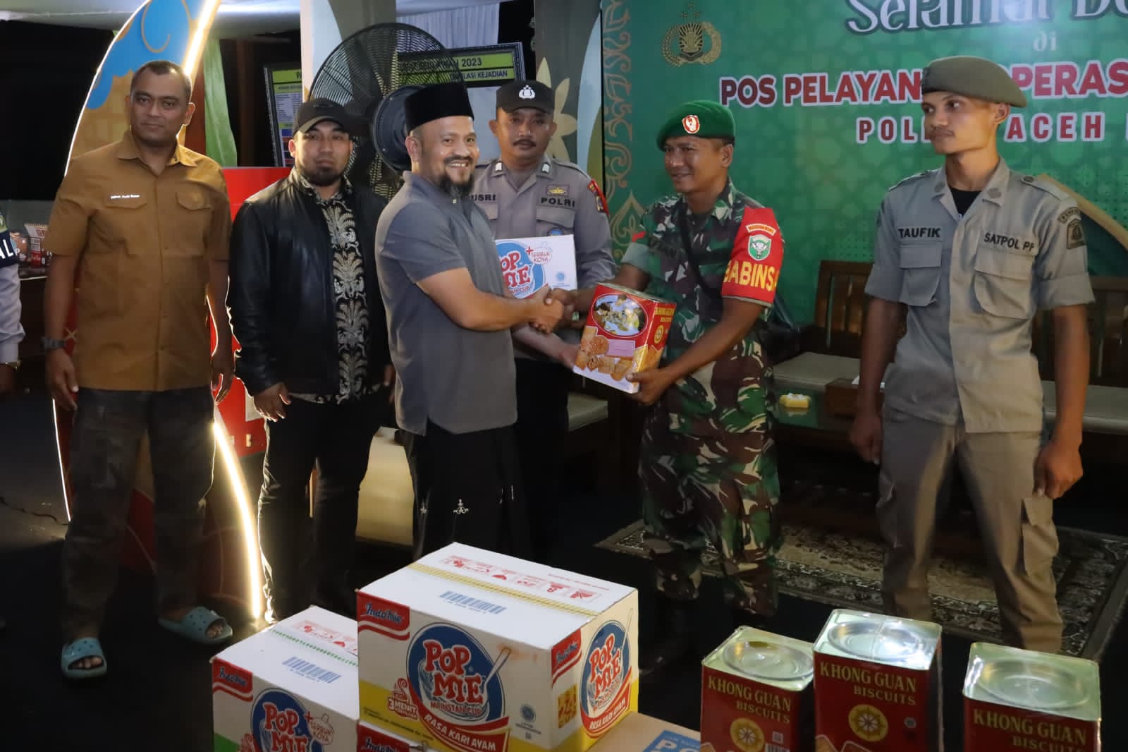 Ketua DPRK Aceh Besar Iskandar Ali SPd MSi, menyerahkan logistik kepada personel TNI yang berjaga selama Mudik Lebaran, di Pos Yan Aneuk Galong, Kecamatan Suka Makmur, Kamis (20/04/2023) malam.