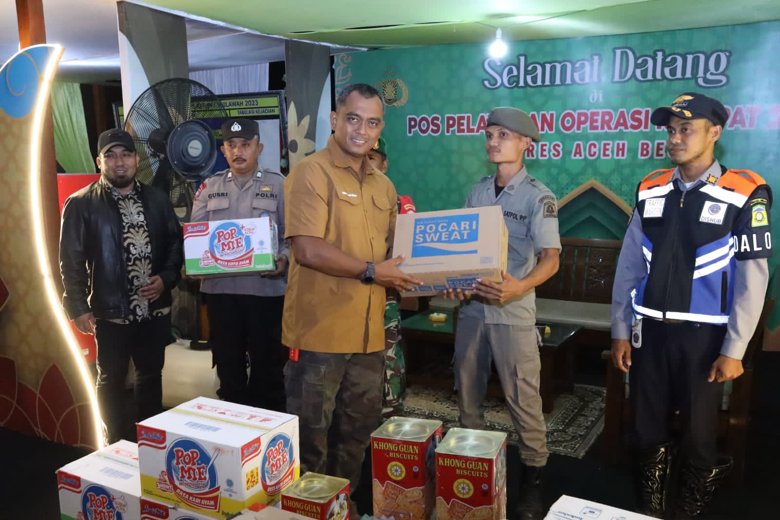 Kapolres Aceh Besar AKBP Charlie Syahputra Bustamam SIK MH menyerahkan logistik kepada anggota Satpol PP yang berjaga selama Mudik Lebaran, di Pos Yan Aneuk Galong, Kecamatan Suka Makmur, Kamis (20/04/2023) malam.