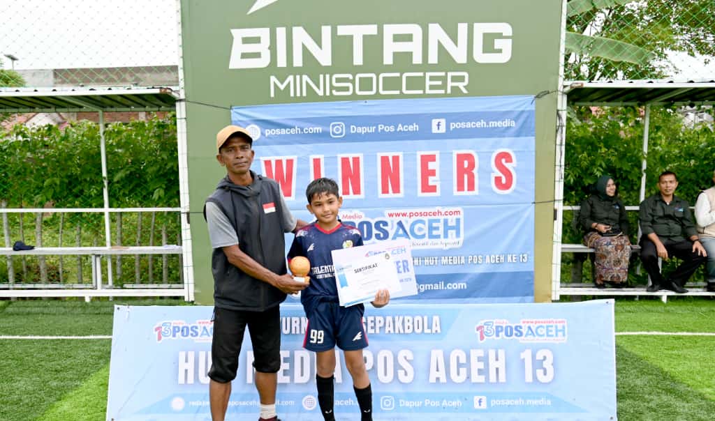 posaceh.com, Banda Aceh – Sekolah Sepakbola (SSB) Talenta Aceh FA, Banda Aceh meraih penghargaan terbanyak dalam Turnamen Sepakbola U-10 dan U-12 HUT ke-13 Pos Aceh yang berakhir di Lapangan Bintang Mini Soccer, Ie Masen Kayee Adang, Kecamatan Ulee Kareng, Banda Aceh, Senin (20/10/2025) sore.