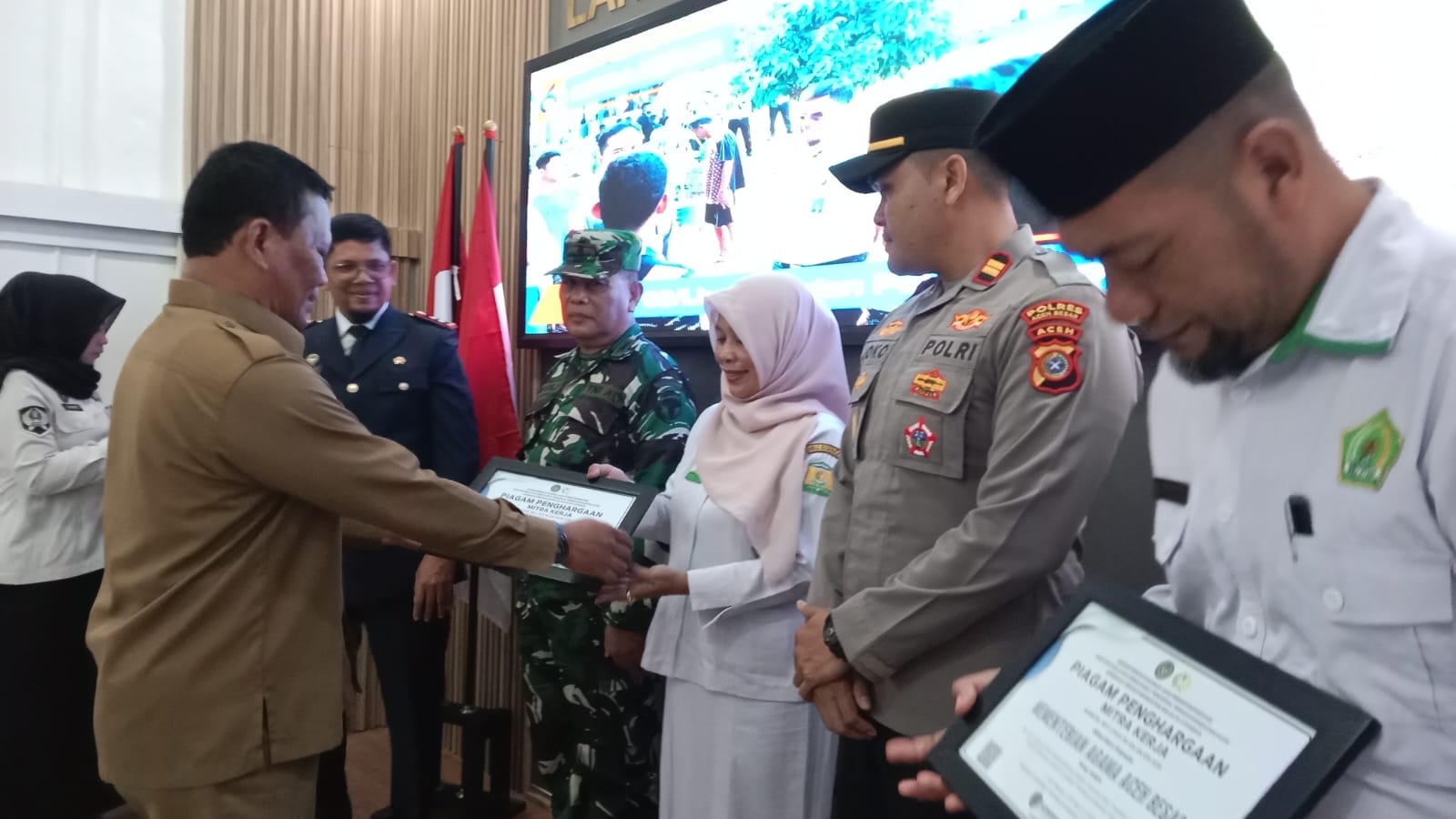 Staf Ahli Bupati Aceh Besar, Ir. Makmun, MT mewakili Bupati H. Muharram Idris, menyerahkan piagam penghargaan kepada Kepala Puskesmas Lhoknga, Elisa SKM, salah satu pihak yang aktif mendukung kegiatan di Lapas Lhoknga, pada peringatan Hari Bakti Pemasyarakatan Ke-62 di Lapas Kelas III Lhoknga, Senin 27 April 2026. FOTO/ YUSRI