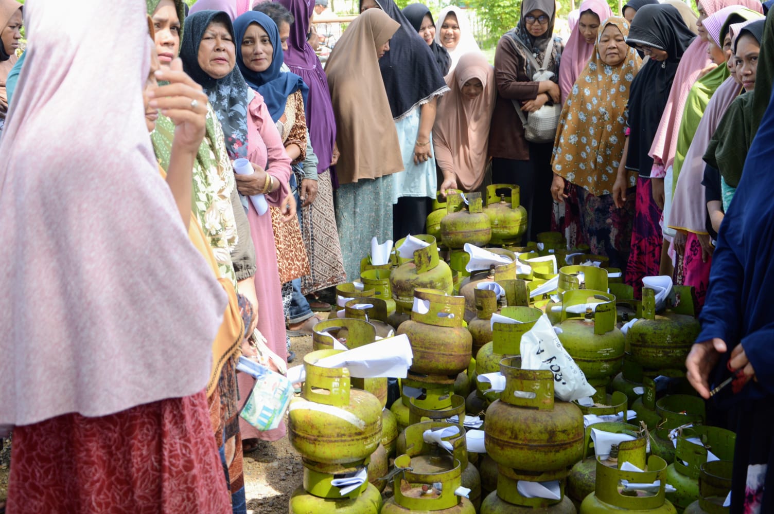 Warga mengantri untuk membeli gas elpiji 3 kilogram bersubsidi pada pergelaran operasi pasar yang digelar oleh Pemkab Aceh Besar bekerja sama bekerja sama dengan PT. Good Gas Qwan di Halaman Masjid Batul Kiran Bilui, Kecamatan Darul, Aceh Besar, Sabtu (19/08/2023) siang. FOTO/BEDU SAINI