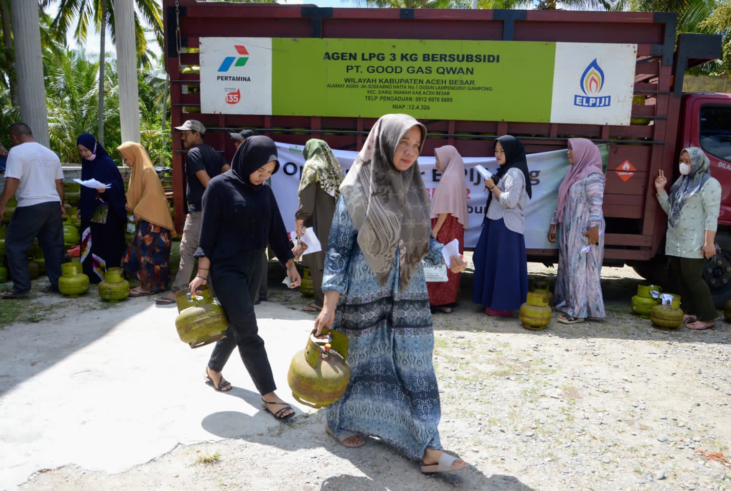 Warga membawa pulang gas Elpiji 3 Kilogram bersubsi dalam pergelaran operasi pasar yang digelar oleh Pemkab Aceh Besar bekerja sama dengan PT. Good Gas Qwan di Halaman Masjid Batul Kiran Bilui, Kecamatan Darul, Aceh Besar, Sabtu (19/08/2023) siang. FOTO/BEDU SAINI