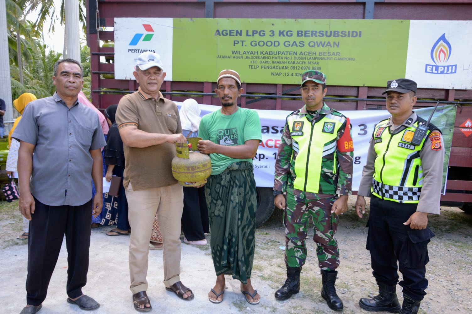 Camat Darul Kamal, Subhan SE MM bersama anggota Danramil dan Kapolsek menyerahkan gas Elpiji 3 Kg secara simbolis yang digelar Pemkab Aceh Besar bekerja sama PT. Good Gas Qwan di Halaman Masjid Batul Kiran Bilui, Kecamatan Darul, Aceh Besar, Sabtu (19/08/2023) siang. FOTO/BEDU SAINI